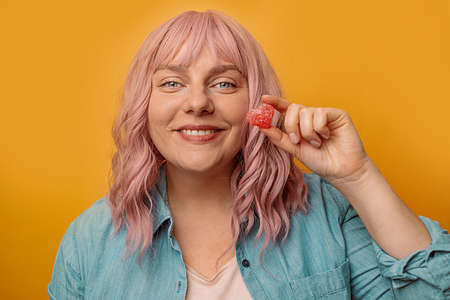Happy woman holding colorful red love shape jelly gummy in hand over yelow wall background. Sweets, confectionery and food concept