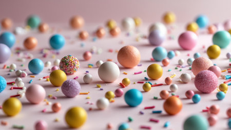 AI Generated. Colorful sprinkles and balls on a pastel background with copy space