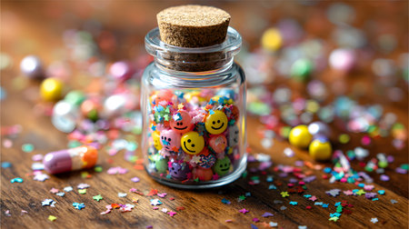 Glass jar filled with colorful beads, smiley faces, and confetti stars, placed on a wooden surface with scattered festive decorations around. A playful and joyful composition symbolizing happiness, positivity, and celebration.