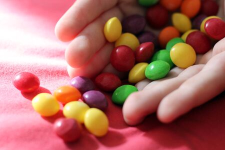 Hands holding a handful of smiling candies, capturing the delight of indulging in sweet treats.