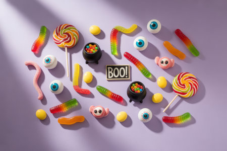 A vibrant assortment of Halloween candies, including gummy worms, eyeball candies, and lollipops, scattered on a purple surface.