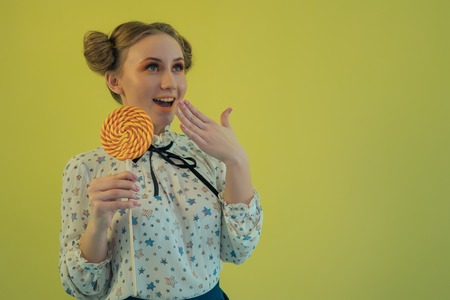 A funny girl with surprise looks away with a lollipop in her hands. Bright makeup.