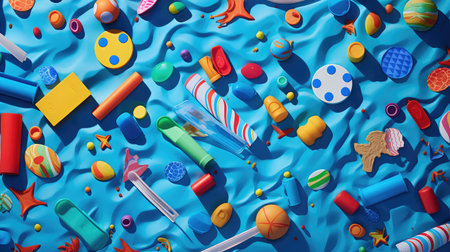A captivating display of various shapes crafted from play dough in vivid hues of pink, yellow, blue, and purple, elegantly scattered on a striking coral backdrop, inspiring imagination.