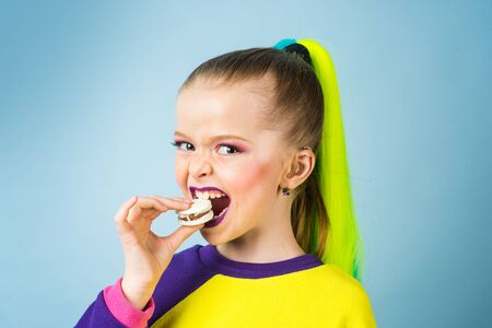 Close-up portrait of nice attractive funny childish addicted hungry cheery girl holding in hands candies licking lip isolated on bright vivid shine vibrant blue green teal turquoise color background