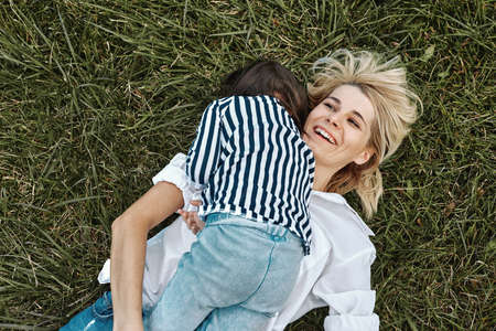 Top view image of happy beautiful woman smiling and playing with her cute little girl lying on green grass in the park. Mother and daughter has fun together. Mother's day