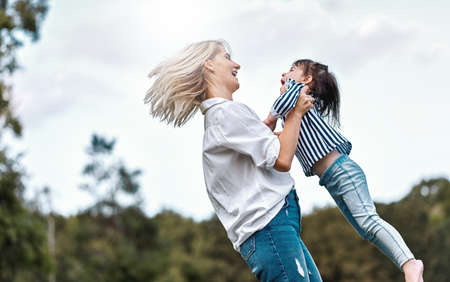 Side view image of happy little daughter playing with her smiling mother in the park. Loving woman and her little kid girl spinning together. Mom and child has fun outdoors. Mother's day