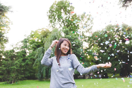 Happy joyful smiling woman spending her free time outside enjoying beautiful summertime weather.