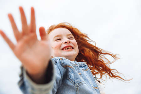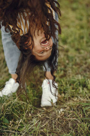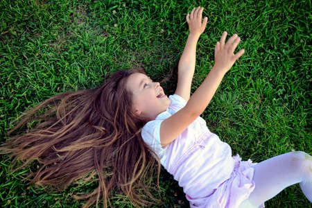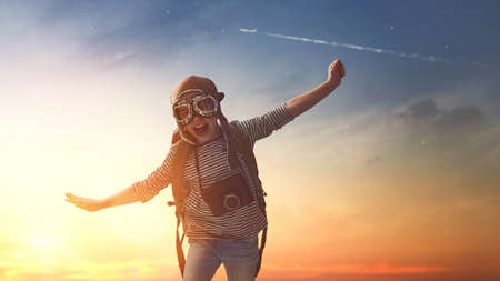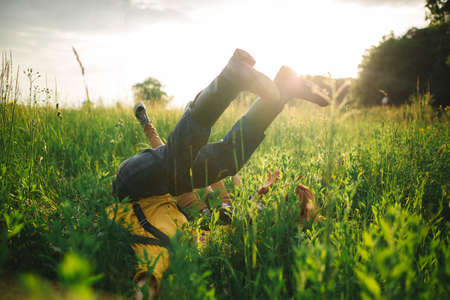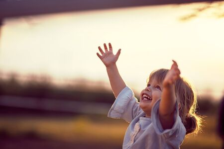 Happy kid looking at the sky enjoying her time outside. fun on countryside, sunset golden hour. Freedom nature concept.