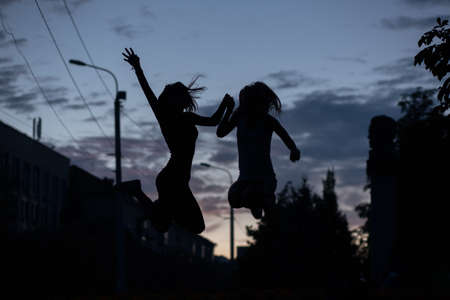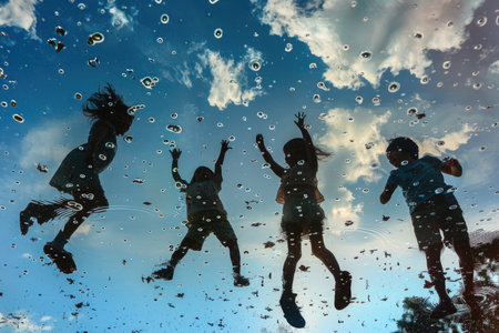 This vibrant photo captures the pure joy of childhood with excited kids jumping on a trampoline Their dynamic mid-air poses and bright surroundings radiate happiness and freedom This image is a perfect portrayal of lighthearted fun and pure delight, ideal for projects needing an uplifting and exuberant feel AI Generative