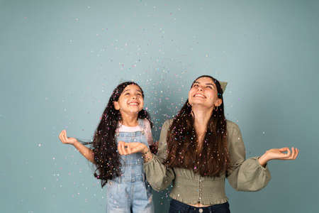 Celebrating with a party! Excited latin family with party hats enjoying playing with confetti