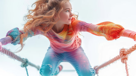 Confident young girl in a colorful sweater climbing ropes, symbolizing adventure, courage, and determination. The bright background highlights her dynamic movement.