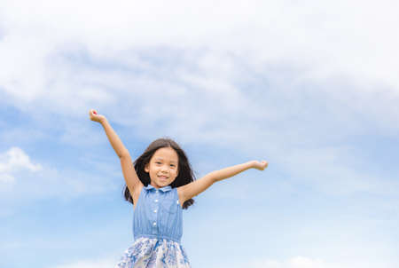Waist up portrait view of the baby girl playing at the summer outdoors. Back view of the cute pretty girl stretching her hands up. Freedom and childhood concept