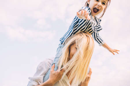 Horizontal image of happy little daughter on a piggy back ride with her smiling mother on sky background. Loving woman and her little girl playing in the park. Mom and kid have fun outside. Motherhood