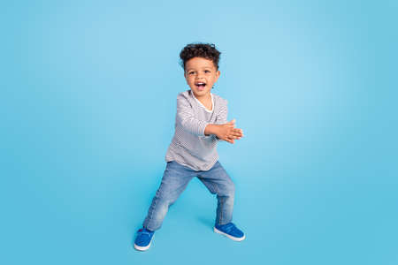 Full length body size view of attractive cheerful boy dancing clapping palms isolated over bright blue color background