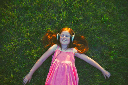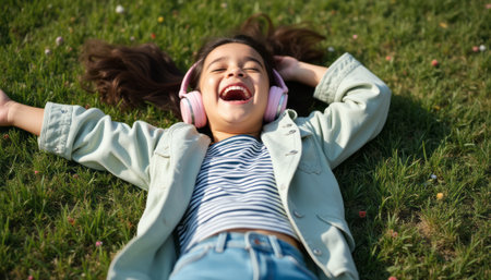 A cheerful young girl with long hair lies on a lush green lawn, wearing pink headphones and laughing joyfully. Her carefree spirit radiates happiness, inviting viewers to share in her blissful moment of music and nature.