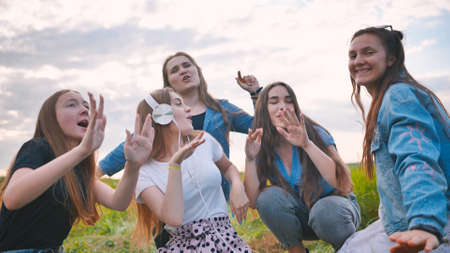A group of girls of friends are listening to music on headphones and dancing to a friend.