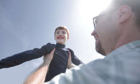Handsome man with his little child spending time together in rural settings. Dad and son are having fun and smiling outdoors