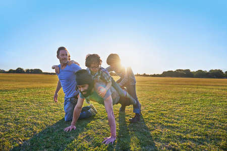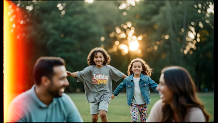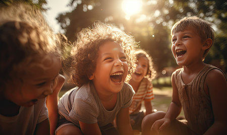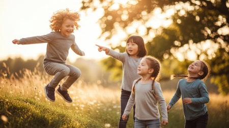 A group of children is captured in a playful outdoor scene, likely during daytime. The image showcases the children interacting in a natural environment. Sunlight bathes the scene, highlighting the green meadow. This image is suitable for various commercial uses, including advertising and editorial content.
