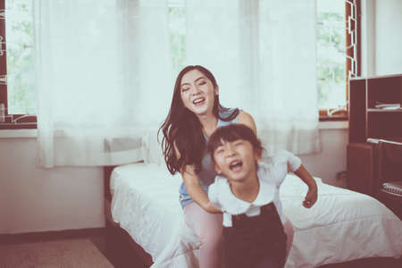 Asian single mom and carrying her cheerful daughter at home together,Happy and funny