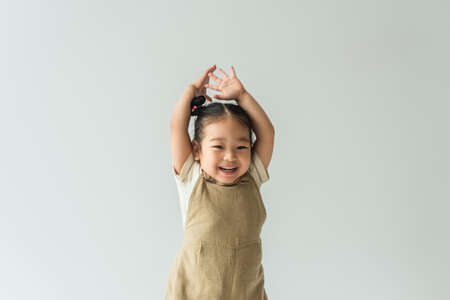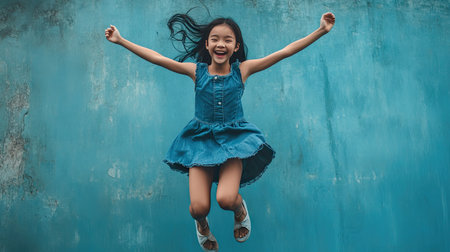 Cheerful Asian girl in a denim dress, jumping in the air with excitement and joy.