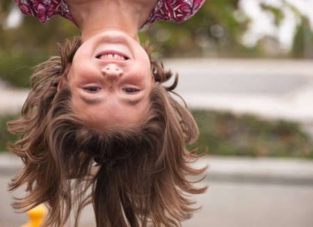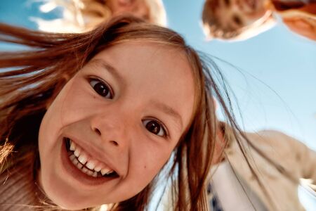 The best day ever. Bottom view of happy and cute little girl smiling at camera while spending time with her family outdoors