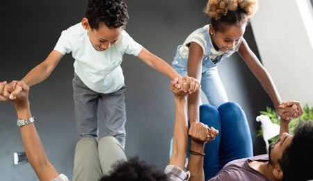 A cheerful young boy with curly hair is joyfully lifted above the ground by an adults hands, radiating pure happiness. The bright, airy room enhances the playful atmosphere, making this moment of carefree joy truly unforgettable.