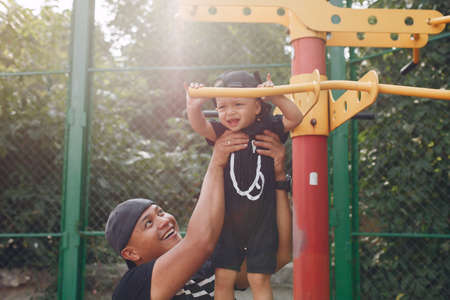 Happy family having fun in the park at sunset. Mother, father and children having fun together outdoors.