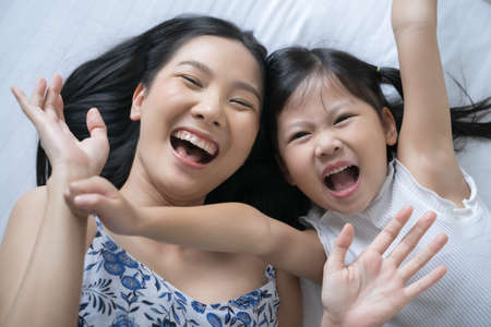 Asian mother and daughter smile and look at camera. Happy love family concept