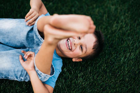 Top view spring child portrait. Funny kid smile and lay on grass. Outdoor funny face of little boy lying on fresh green grass. Summer fun, happy childhood.