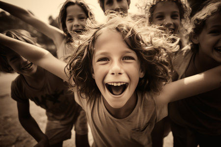 Joyful group of diverse children smiling and laughing outdoors on a bright sunny day, showcasing happiness, friendship, and fun.