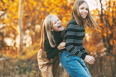 Two happy girls sisters laughing, having fun and playing in the fall in nature outdoors in the autumn park