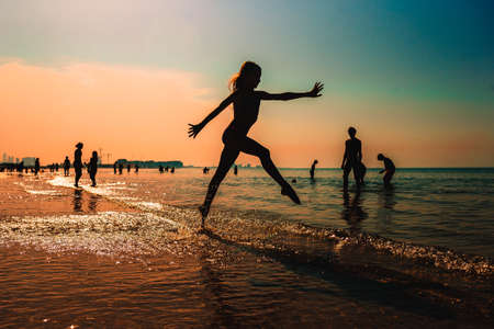 An energetic scene unfolds as a diverse group of individuals joyfully leaps into the air, their expressions filled with exhilaration and freedom.