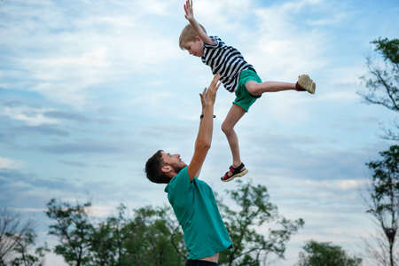 A cheerful boy is tossed into the air by his dad during a fun bonding activity at the park, surrounded by warm evening sunlight. Copy space