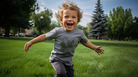 A joyful child happily playing energetically in a beautiful sunny park setting