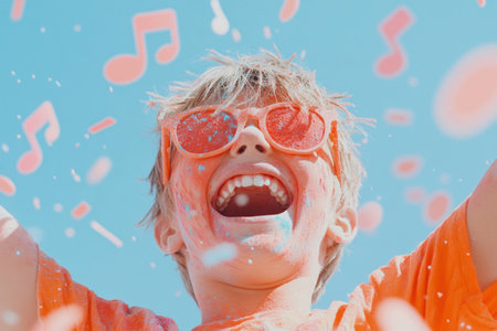 A joyful young boy celebrating with colorful music notes and vibrant confetti against a bright blue sky, embodying happiness and carefree moments in a summer festival