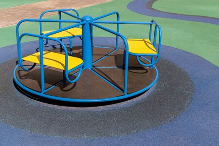 Roundabout is on playground. Area with coating of rubber crumbs. Sunny day