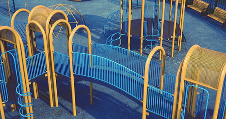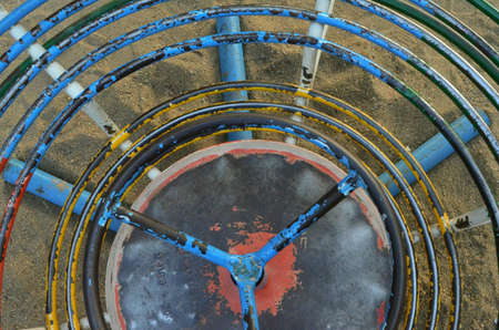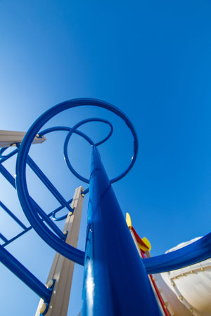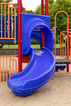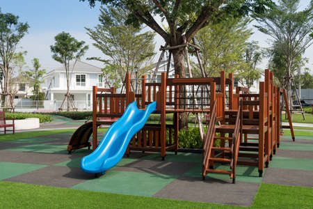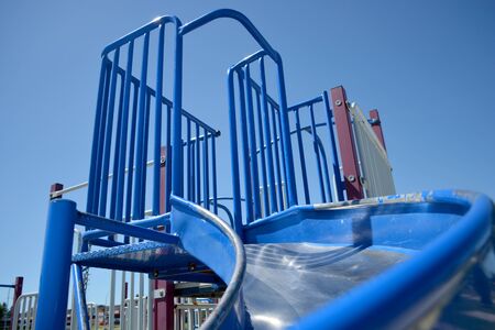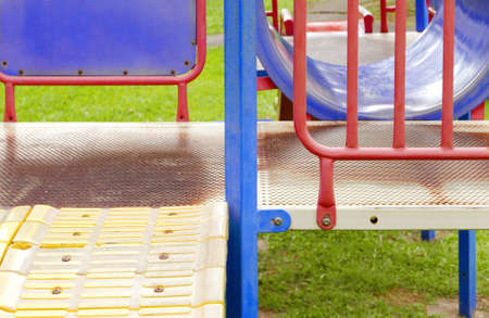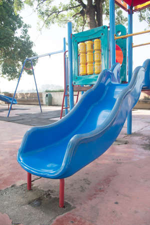Happy Childhood kid playground fun for leisure and recreation activity with toy,stairs slides equipment leftover and climb.Nobody season ladder nature ground outdoor on yard in the park in color style
