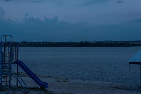 Empty swing at the playground in the rain. Children's swing in the park, wooden benches, slides, sports equipment. Empty city, quarantine. The concept of loneliness.