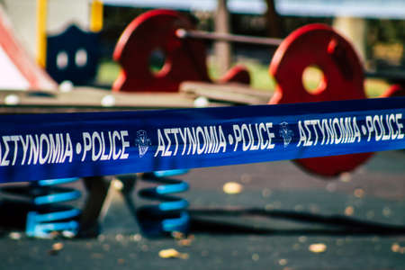 Limassol Cyprus March 24, 2020 View of police sign in a public garden due to the epidemic of Coronavirus in the city of Limassol in Cyprus island
