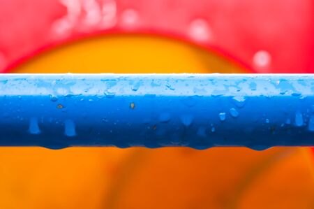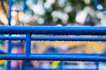 Water drops on the blue metal fence in the playground. Shallow depth of field.