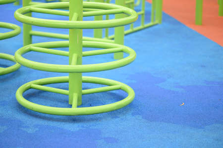 Wallpaper background of rubber blue and green cylinders on a kid’s playground with blue rough floor with tree shadows. No people.