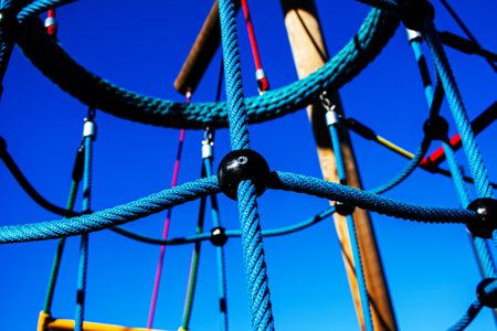 Children's playground in detail. Rope ladder in children's area. Blue ropes connected in net. Place to play for children in summer. urban infrastructure.