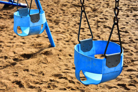 Children playground in the park with morning sunlight. Selected focus on the swing.