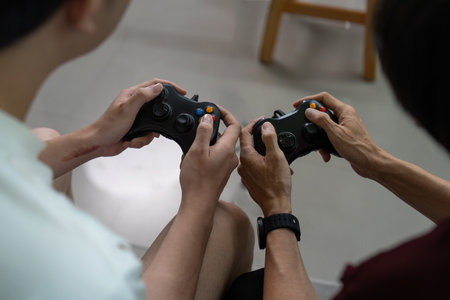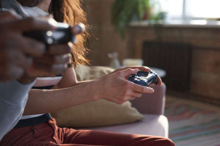 Gaming Connection. Close-up of hands holding game controllers during a friendly competition.