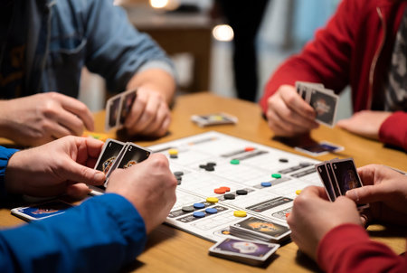 Group of creative multietnic friends sitting at wooden table. People having fun while playing board game.