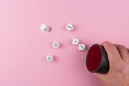 directly above view of player throwing or rolling dice using a dice shaker against pink background