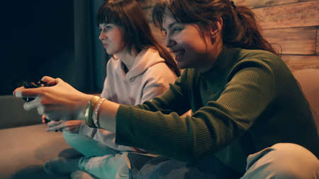 Two young woman playing console video game with gamepad controllers sitting on sofa. Female gamers having fun and smiling at home together online entertainment.
