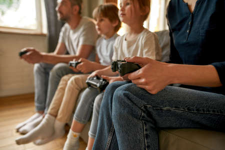 Close up of family with kids play video game online