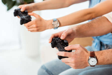Cropped view of man playing video game with girlfriend at home