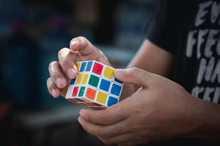 CHON BURI, THAILAND - JULY 29, 2020: Handsome man wearing casual clothes collect Rubik's Cube. Rubik's Cube invented by a Hungarian architect Erno Rubik in 1974. Selective focus. Copy space.